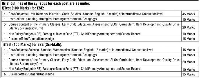 ESE NTS Test will be consist of 100 Marks in which 45 marks are for the Core Subjects for which you are applying, 10 marks are for the Instructional Planning, Strategies, learning Environment, 20 marks are for the course content of the primary classes, Early child education, 10 marks are for the Non Salary Budgets, Farooq-E-Taleem fund and 15 marks are for the Current Affairs and General Knowledge.